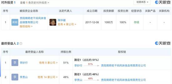 在陶华碧带领下,1998年到2014年迈干妈的产量从5000万涨到40亿元。2014年6月,陶华碧将自己手中仅有的1%的股权转让给了次子李妙行,淡出管理层,老干妈的股权结构为次子李妙行持股51%,长子李贵山持股49%。天眼查显现,陶华碧仍是法定代表人和董事长。